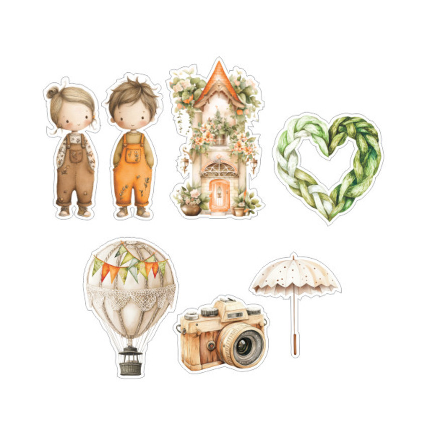 Imagem: Casinha, balão, coração, sombrinha, máquina fotoráfica, menino e menina.